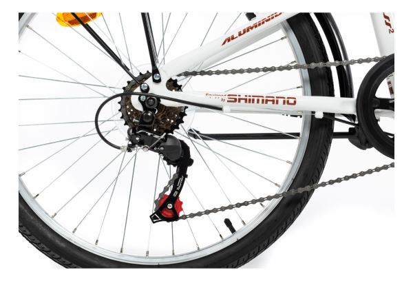 Está montada sobre un cuadro de aluminio muy ligero y es capaz de adaptarse a los cambios de pendiente que presente el recorrido gracias a un cambio Shimano de 6 velocidades. Es una bici de diseño 100% urbano, con ruedas de 24 pulgadas (frente a las de 20″” de su “”hermana pequeña””, la First Class) y que incluye elementos muy prácticos (guardabarros, caballete o portabultos) y elegantes, como el sillín y los puños del manillar en símil cuero marrón.